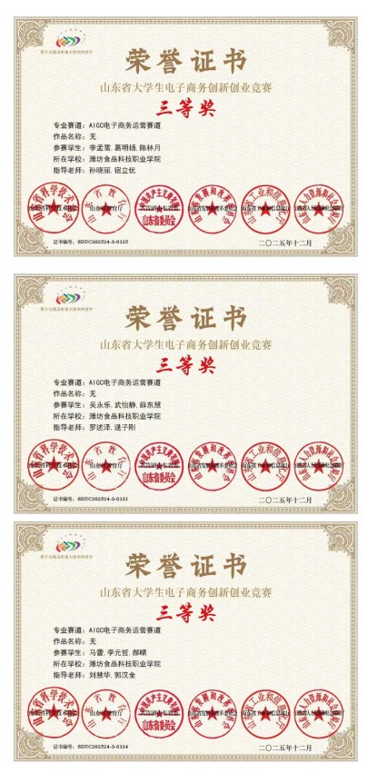 近日,由山东省科学技术协会、山东省教育厅、山东省工业和信息化厅等多部门联合主办的第十七届山东省大学生科技节——山东省大学生电子商务创新创业竞赛圆满结束。在AIGC电子商务运营赛道中,我校管理学院数字商贸系学子表现突出,共三支参赛队伍荣获三等奖,展现了扎实的专业素养与创新实践能力。
