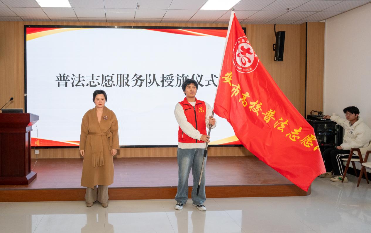 仪式上,学校副校长田敬成致辞,阐述了法治教育与人才培养融合的意义。安丘市司法局党组成员、副局长鹿文萍解读普法工作重点并对志愿队提出工作期望。随后,与会领导为高校普法志愿服务队授旗,并为学生代表颁发法治书籍。市司法局崔守成科长详细介绍“安丘市智惠学法服务平台”功能及使用方法,助力师生便捷学法。最后,学院法治副校长作总结讲话,就深化校地普法合作表态。